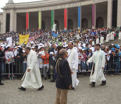 Já o sol estava à nascente, coberto pelo céu nublado, quando à nossa espera e de milhares de crianças de todo o país estava Nossa Senhora, representada por muitas pessoas que se dedicaram a preparar e organizar as dinâmicas para este dia. Foram muitas as experiências neste local sagrado. A multidão compunha uma tela de cores, ora com chapéus azuis, amarelos, brancos… placas informativas que testemunhavam a multiplicidade de regiões do nosso Portugal, saudações a Maria, a Jesus, a Deus, oferendas…